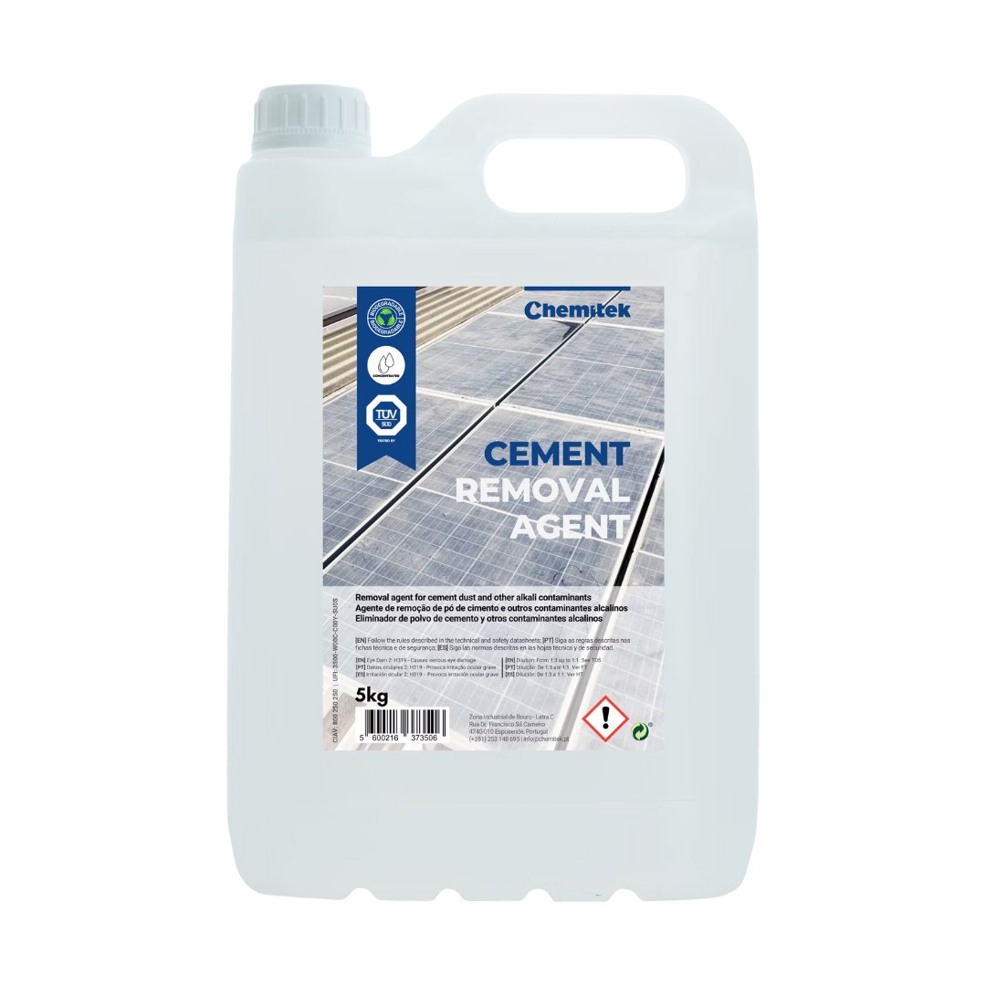 Chemitek Cement Removal Agent (CRA) is a concentrated biodegradable agent for cleaning cement dust, stone dust, hard water stains, rust and other alkaline contaminants that become encrusted on the glass surface of solar modules.