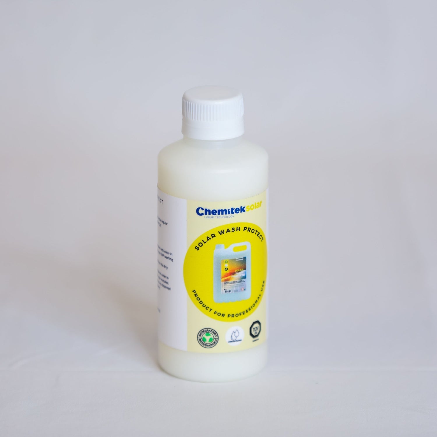 This is a 250ML Sample - Only available while supplies last! Solar Wash Protect (SWP) is a concentrated antistatic cleaning and protection product specifically developed for photovoltaic solar panels, effective in cleaning a wide range of organic dirt on the solar module. The antistatic properties of SWP make future cleanings easier, keeps the panel cleaner between cleanings, reduces cleaning time and water consumption by up to 50%. Using the SWP solution to wash the solar modules, when compared to cleaning with water alone, allows an increase in solar panel efficiency of up to 5%, resulting in significant economic benefits for the PV system owner. It is a solution designed for professionals who install photovoltaic plants, solar panel cleaning companies, and solar parks with their own maintenance teams. If you are a professional looking to differentiate your services to the end customer, use a unique and innovative product, fully tested and certified by the international laboratory TÜV Sud, with letters of compliance from 12 of the 15 largest producers of photovoltaic solar panels in the world, biodegradable and environmentally friendly available on the market. SOLAR WASH PROTECT 50 is a concentrated product which must be diluted in water to form the SWP solution. This SWP solution is used to wash photovoltaic solar panels and its quick action makes it easy to clean all kinds of dirt. After the efficient washing it leaves on the solar panel a surface protection that will not allow the dirt to adhere so easily, protecting the solar panel from scratches and avoiding the fast decrease of solar panel power output due to soiling accumulation. Dilution: 1 kg of SWP 50 to 50 litres of water. Looking for a higher concentration? CLICK HERE Use the Dosatron to accurately dilute your pure water! Read the technical datasheet for Solar Wash Protect 50.