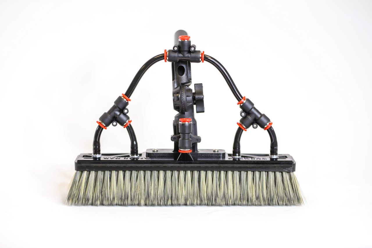 The Tucker® Alpha GLIDE brush is the new standard in Water Fed brushes. This premium synthetic bristle window cleaning brush is built around our dual trim, 4 pencil jet brush but with some serious additions that even the most seasoned window cleaning professional will appreciate. It includes an over the top rinse bar as well as our swiveling gooseneck. This setup allows complete flexibility in cleaning to your specific style. You can choose to rinse directly through the 4 internal pencil jets, the over the top rinse bar, or using a Y-adapter you can use both at once. The swiveling gooseneck allows the experienced professional to rock the brush back and forth on the surface of the window, while maintaining contact and rinse power.