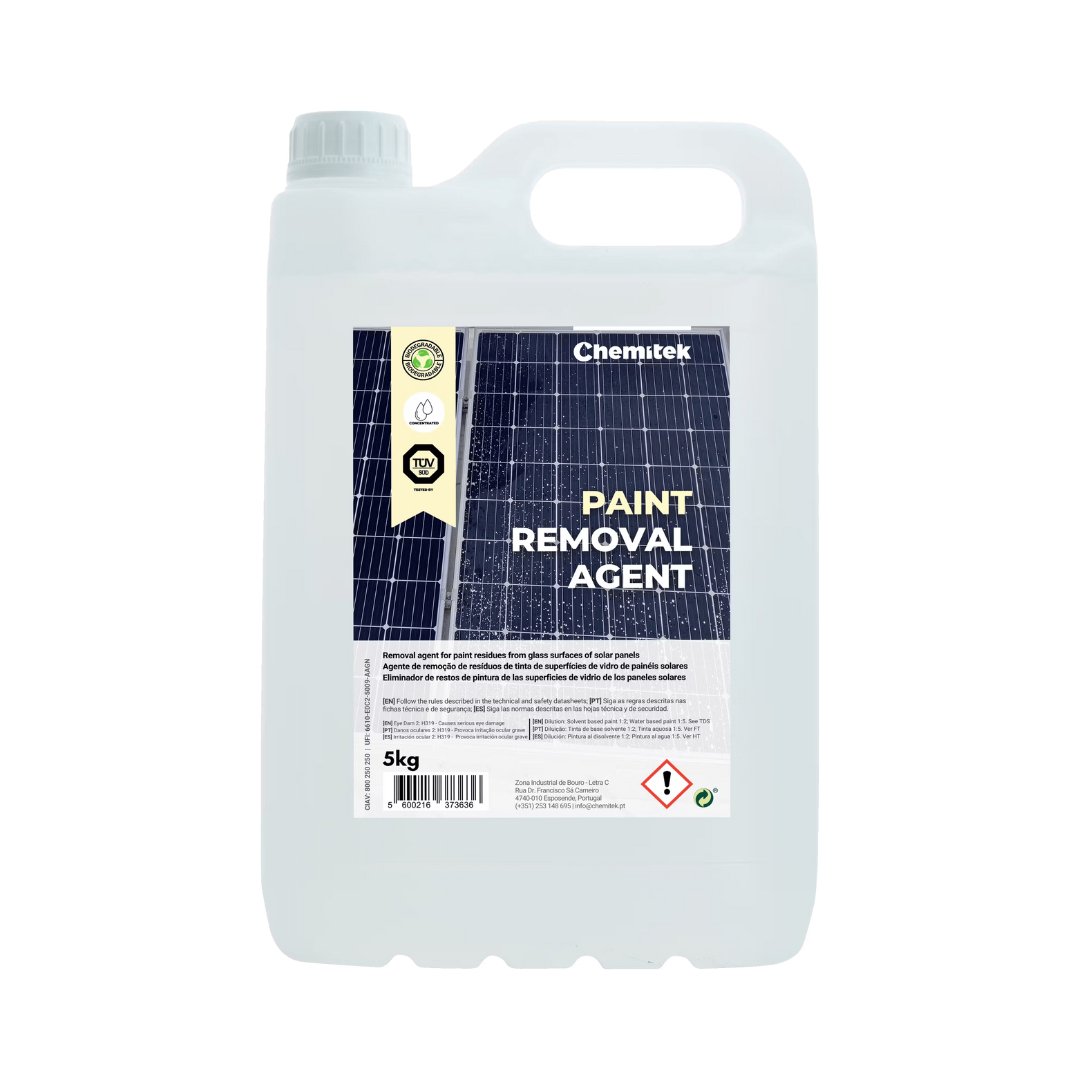 Chemitek Paint Removal Agent (PRA) is a cleaning product specifically developed for the removal of paint residues from glass surfaces of solar panels. The formula of this solution is designed to be as mild as possible with the solar panels, so that it is easy to use and does not present any health risks for professionals.
